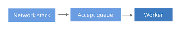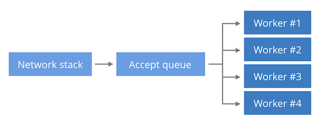 新连接位于单个内核数据结构中(套接字监听),多个工作进程同时执行accept()调用和处理请求。