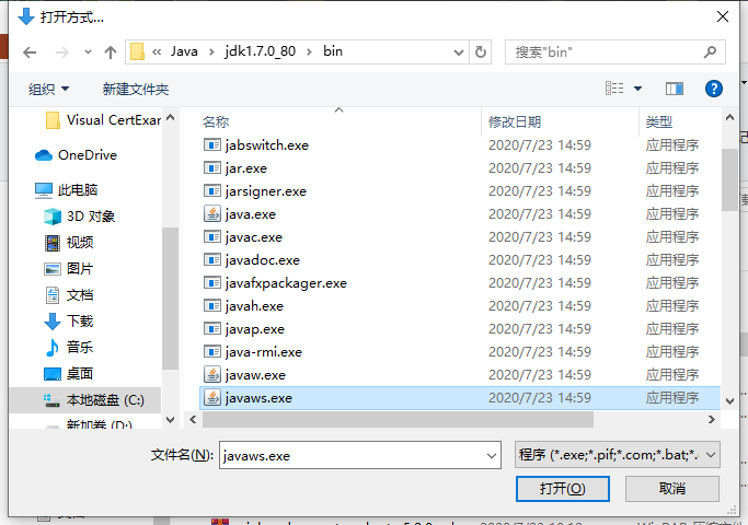 鼠标右键步骤1下载的文件 -> 打开方式 -> 选择jre1.7的javaws.exe文件