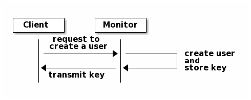 要使用cephx,管理员必须首先设置用户。在下面的图表中client.admin从命令行调用ceph auth get-or-create-key来生成用户名和密钥。 Cephauth子系统生成用户名和密钥,将一个副本存储在监视器中,并将用户的密钥传输回client.admin。 这意味着客户端和监视器共享一个密钥来使用cephx.