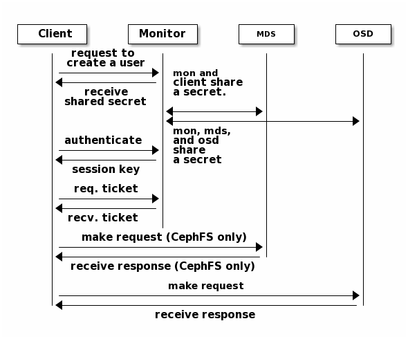 为了使用监视器进行身份验证,客户端将用户名传递给监视器,监视器生成一个会话密钥并使用与用户名相关联的密钥对其进行加密。 然后,监视器将加密的票据传输回客户端。随后,客户机使用共享密钥解密,以检索会话密钥。会话密钥标识当前会话的用户。 然后客户端使用会话密钥签名的用户请求票据。监视器生成一个票据,用用户的密钥对其加密,并将其传回客户机。 客户端解密票据,并使用它对整个集群中的OSDs和元数据服务器的请求进行签名