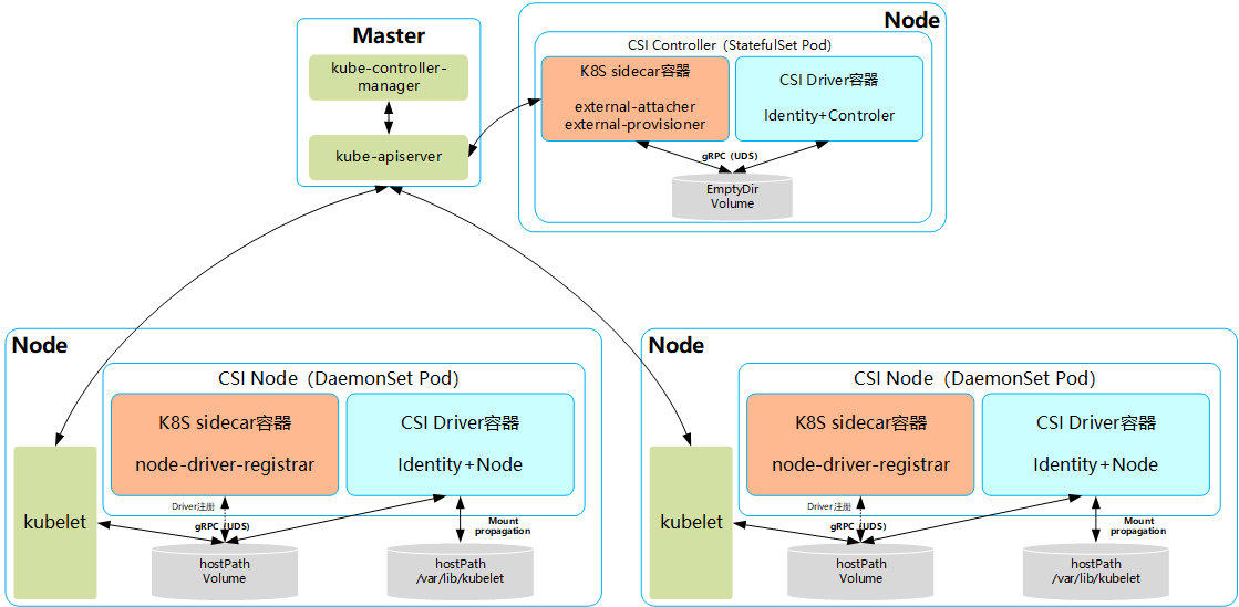node-driver-registrar容器与kubelet通过Node主机的一个hostPath目录下的unixsocket进行通信。CSI Driver容器与kubelet通过Node主机的另一个hostPath目录下的unixsocket进行通信,同时需要将kubelet的工作目录(默认为/var/lib/kubelet)挂载给CSIDriver容器,用于为Pod进行Volume的管理操作(包括mount、umount等)。