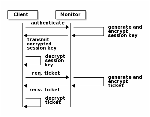 然后客户端使用会话密钥签名的用户请求票据。监视器生成一个票据,用用户的密钥对其加密,并将其传回客户机。