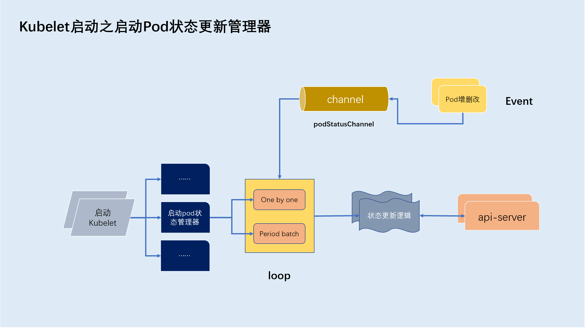 对于pod状态的变更会推入名为podStatusChannel的通道,statusManage在启动的时候会开辟一个goroutine,用于循环处理podStatusChannel内pod状态变更对象。